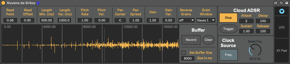 Nuvens de grãos (Clouds of grains) is a Max for Live granulator focused on producing rich textures from pre-recorded or live-recorded audio. It allows for modulation and automation of parameters in order to create constantly evolving textures.
